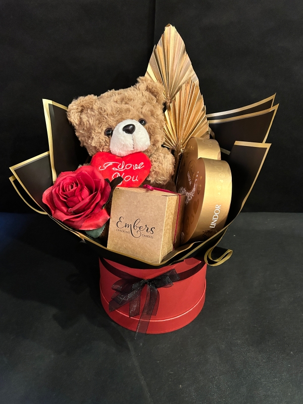 A Hat box including Chocolates, Embers crackle wick candle and heart Teddy bear.