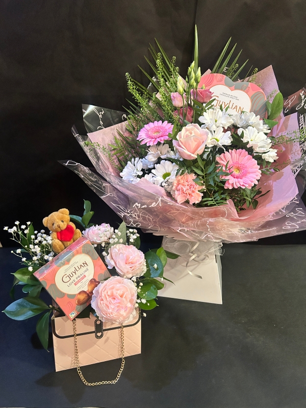 A special Mother and Daughter Package.  one large pretty pink flower bouquet with heart shaped box of chocolates, and a little pink handbag arrangement with mini chocolates for the two special ladies who hold your heart.