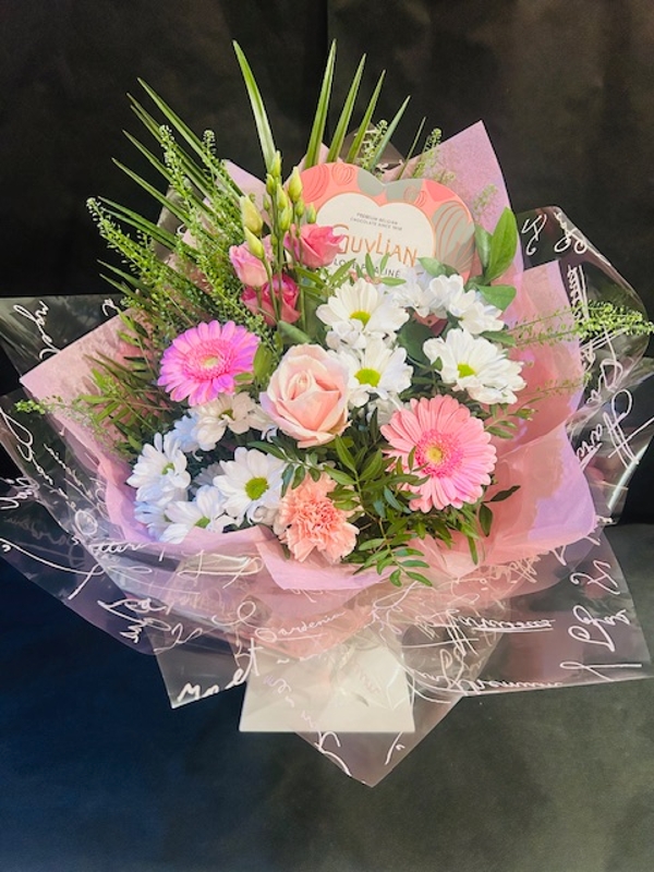 A lovely mix of flowers arranged for your special person, with a Heart-Shaped box of chocolates. All wrapped and finished in water box arrangement.